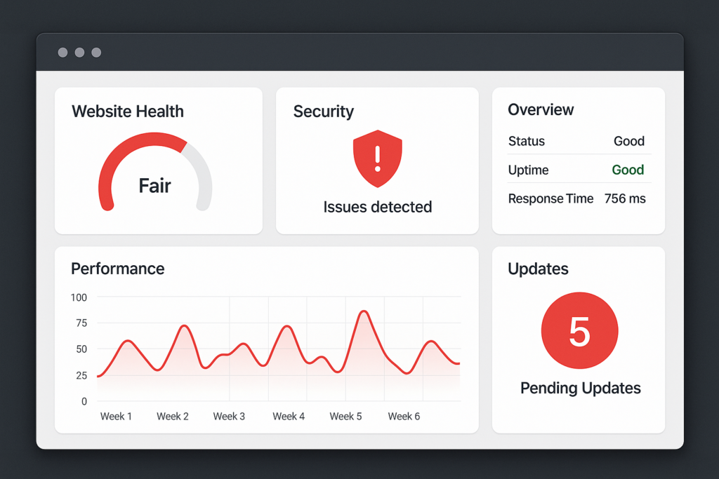 Our monitoring system scans for outdated plugins and themes, security vulnerabilities, WordPress core update requirements, and performance issues.